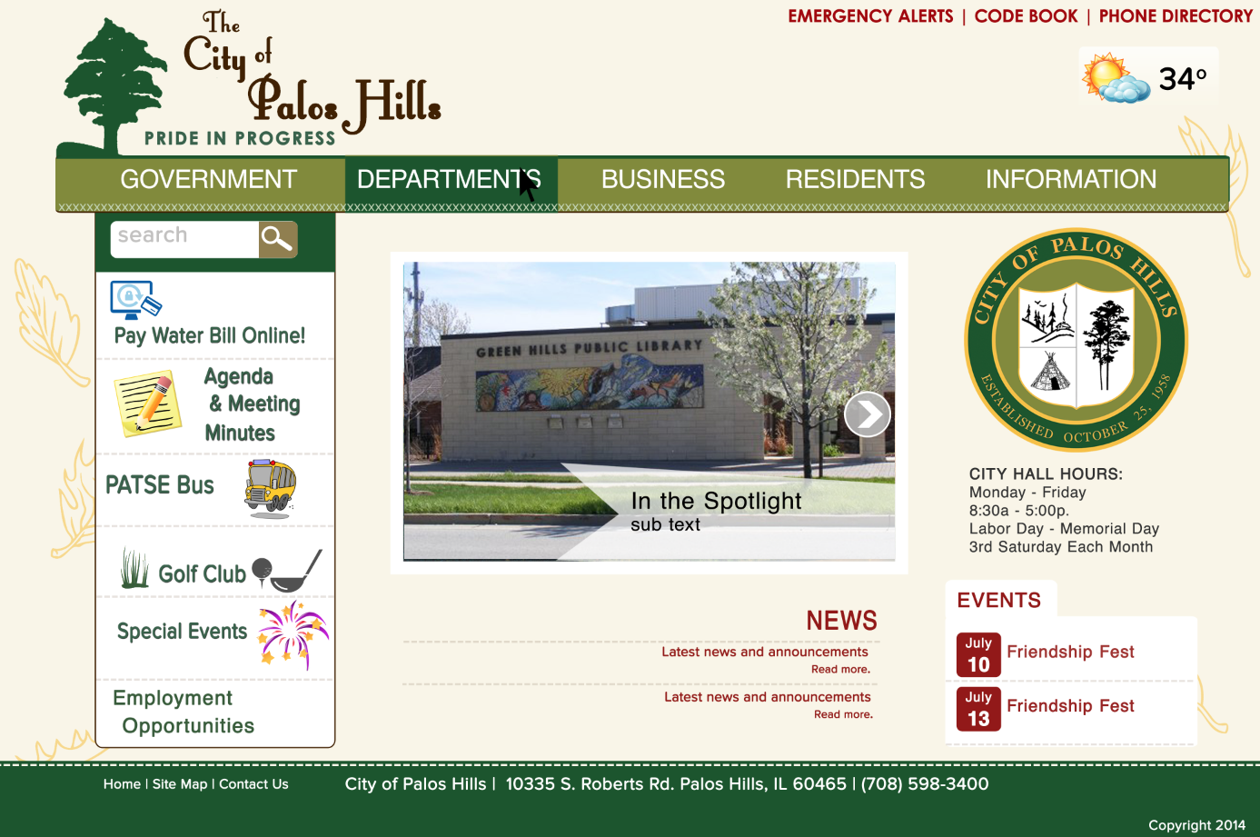 In the Spring (of 2014) I had the opportunity to do an internship with the City of Palos Hills, Illinois. I worked as the Project Manager/Design/Developer in conjunction with the city IT Director to plan, design and code templates for the new city government website. The goal was to create a design that allowed users to easily access important city information. Completion of the site is scheduled for the end of June 2014.